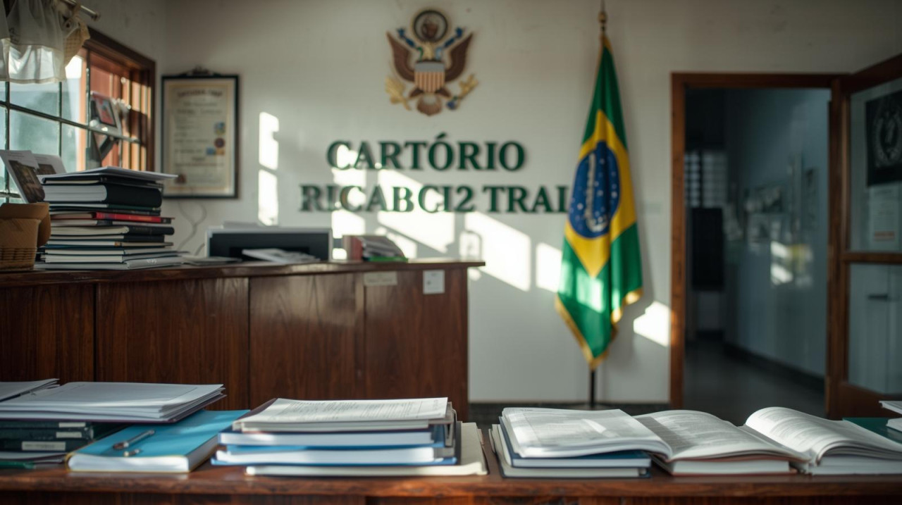 Интерьер Cartório для регистрации рождения, стол с документами и флагом Бразилии, дневной свет.