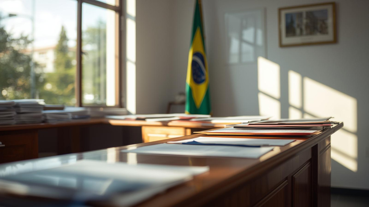 Интерьер бразильского Cartório (гражданский ЗАГС), стол с документами и флаг Бразилии, реалистичная