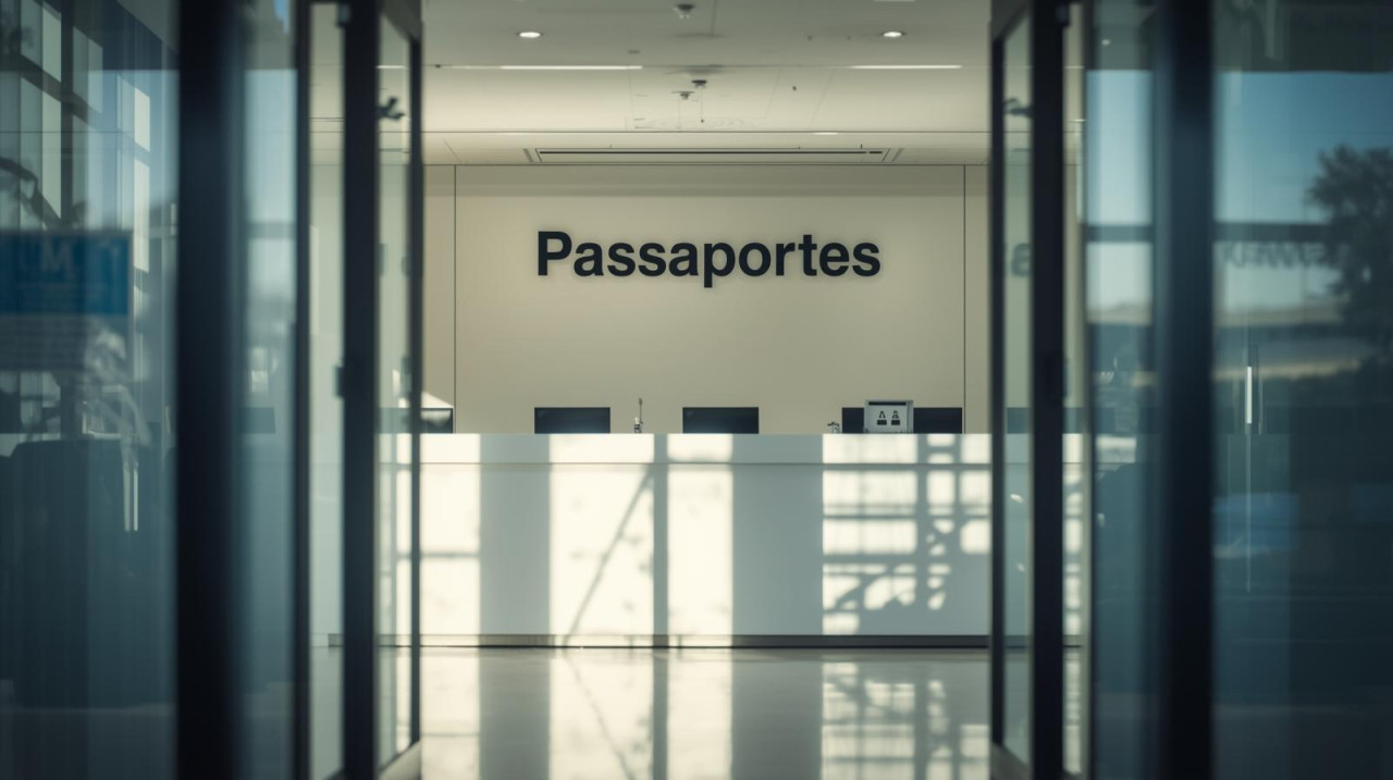 Вход или стойка офиса Polícia Federal для паспортов, современное госздание, дневной свет,