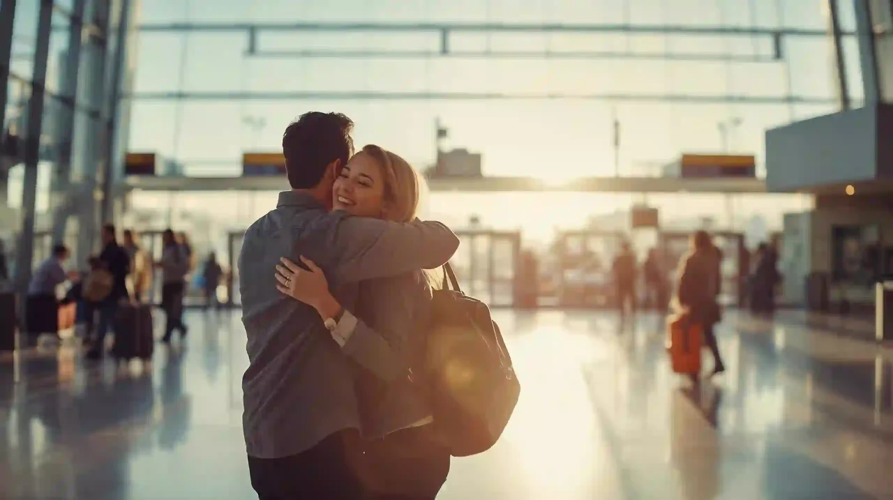 неглубокая резкость; пара обнимается после прилёта; чистый фон; без логотипов и без читаемых